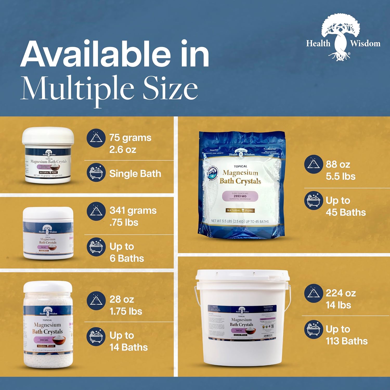 Health and Wisdom Magnesium Bath Crystals - Bath Salts with High Concentration & Enhanced Absorption for Muscle & Joint Relief - Dead Sea Sourced - Unscented - 14 lbs - Up to 113 Uses