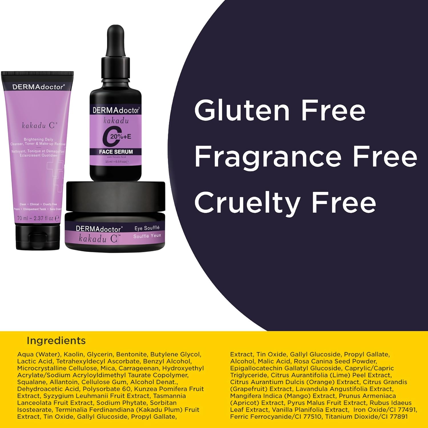 DERMAdoctor 20% Vitamin C Face Serum 0.5 fl oz Cleanser 2.37 fl oz with Caffeine Eye Cream Vitamin E & Ferulic Acid | Kakadu C Anti Aging, Hydrating & Discoloration Correcting Serum