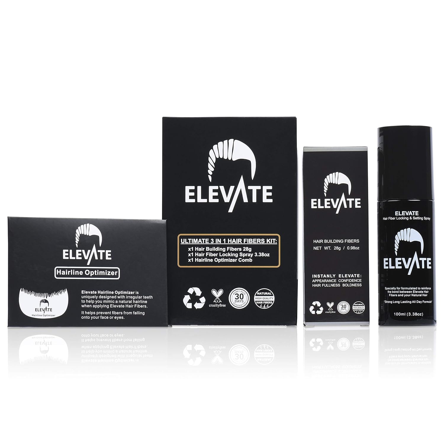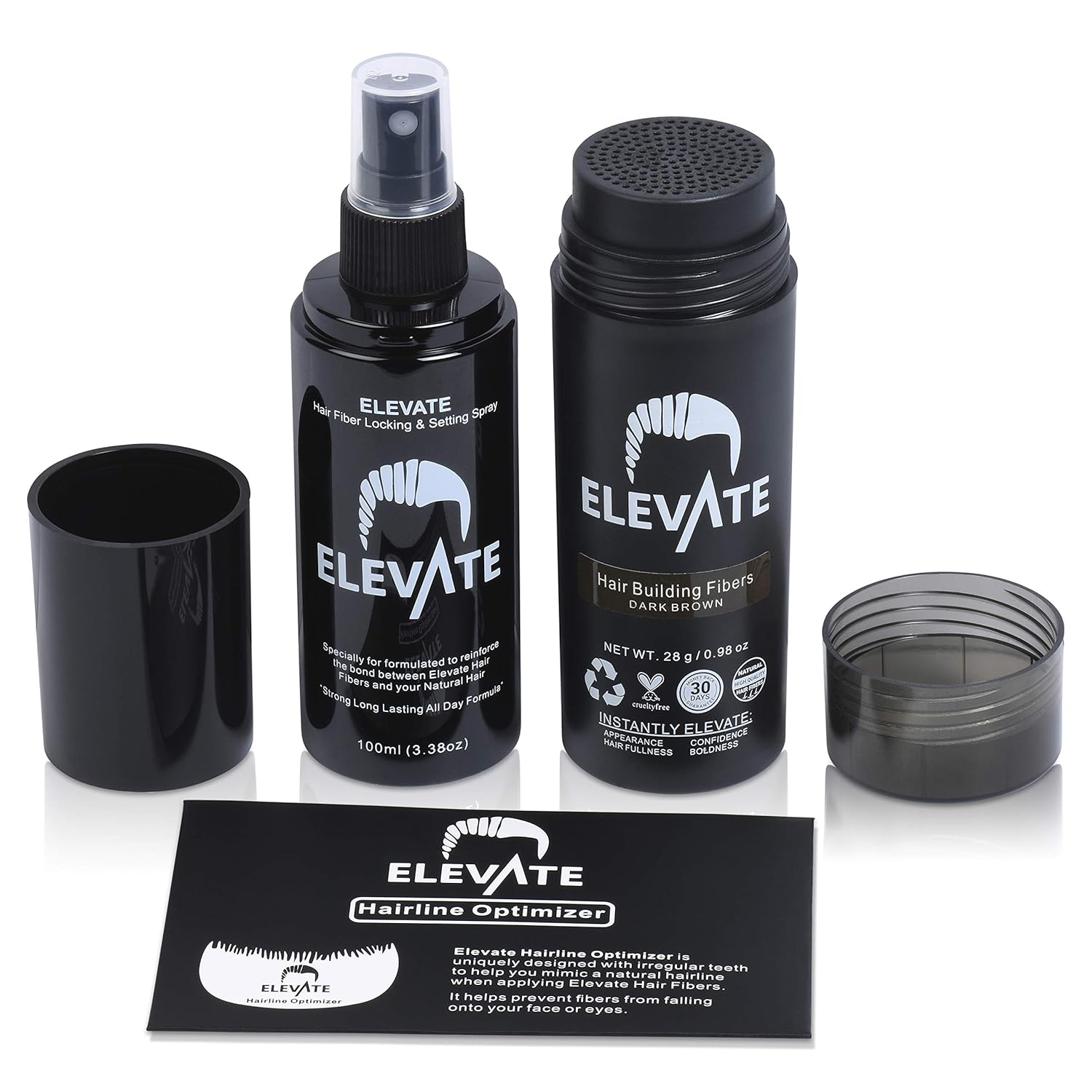 - DARK BROWN COMBO 3-IN-1 VALUE KIT - INSTANT THICKER FULLER HAIR IN SECONDS: Elevate Hair Building Fibers give you the immediate appearance of thicker, fuller hair. The Hair Fiber Locking Spray is a long-lasting all-day formula to keep fibers in place and the hairline optimizer comb allows precise application when applying fibers in the hairline area.