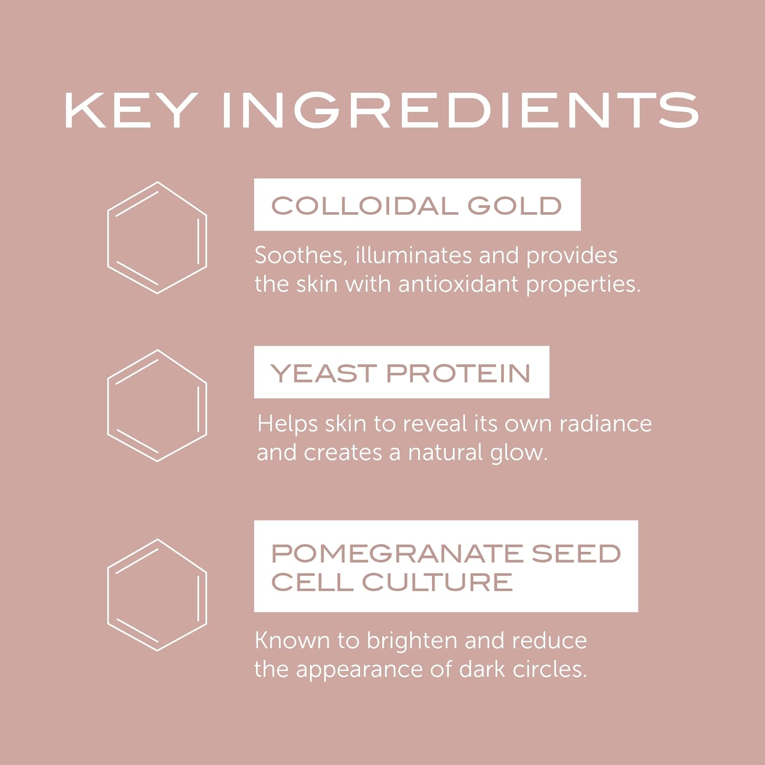 - Rose Gold: Rose is a botanical extract high in antioxidants which helps to protect the skin against external aggressors. Gold extract brightens, evens skin tone, and improves circulation.