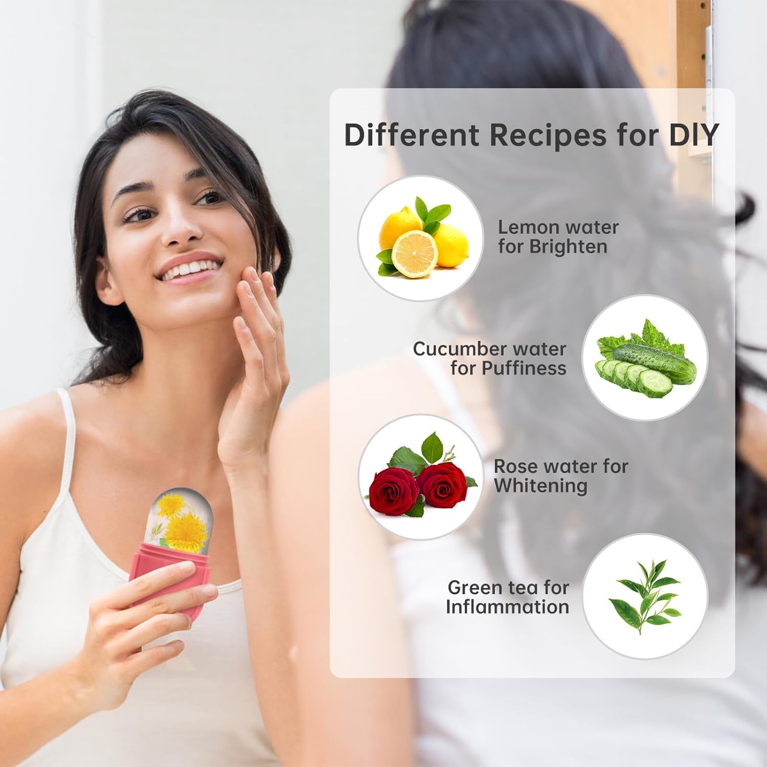 - 💙【Customize recipes & Perfect Gift】To really enhance the skin effect, you can use your creativity and customize the formula according to your specific skin needs, such as lemonade for whitening, green tea for inflammation, cucumber water for reducing swelling, and coconut for improving skin Milk. You can use a juicer to squeeze them into juice, then add water, essential oils, and roses to the ice tray. Treat yourself or a loved one to a gift that keeps on giving.