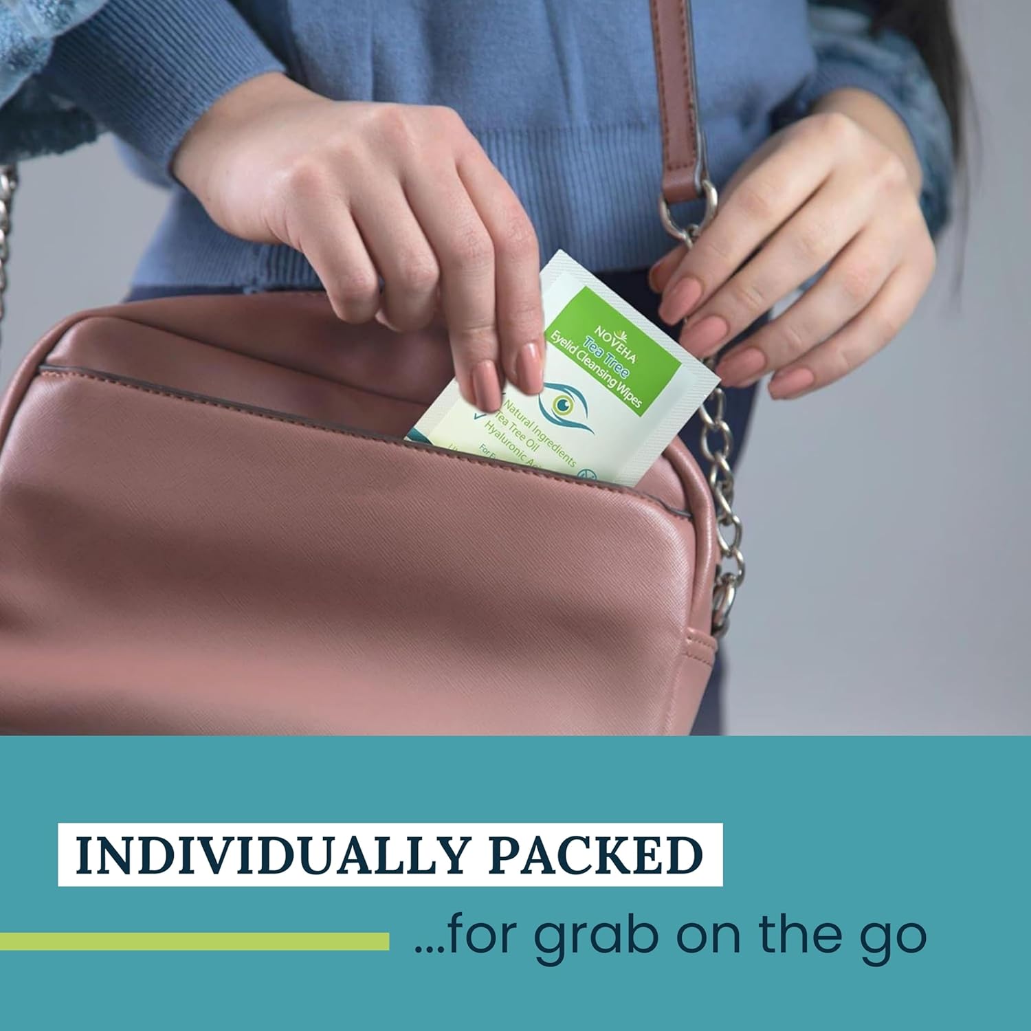 NOVEHA 120Pcs Tea Tree Oil Eyelid & Lash Wipes With Hyaluronic Acid, Green Tea & Chamomile For Blepharitis & Itchy Eyes, Individually Wrapped Eyelash Wipes, Natural Makeup Remover & Cleanser (2 Pack)