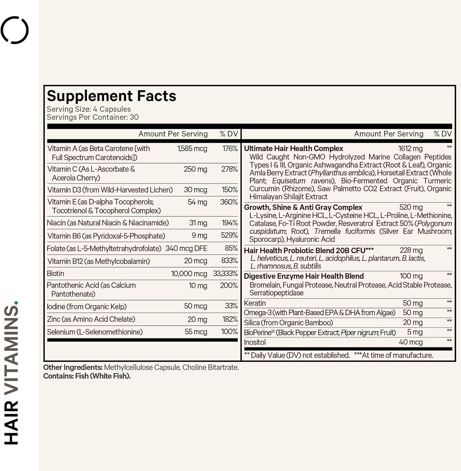 - Manufactured in the USA: Codeage Hair capsules vitamins formula is non-GMO, gluten, soy, and dairy-free. It is also free of shellfish. This beauty supplement is manufactured in the USA with global ingredients in a cGMP-certified facility for quality and purity. Each bottle provides a one-month supply.