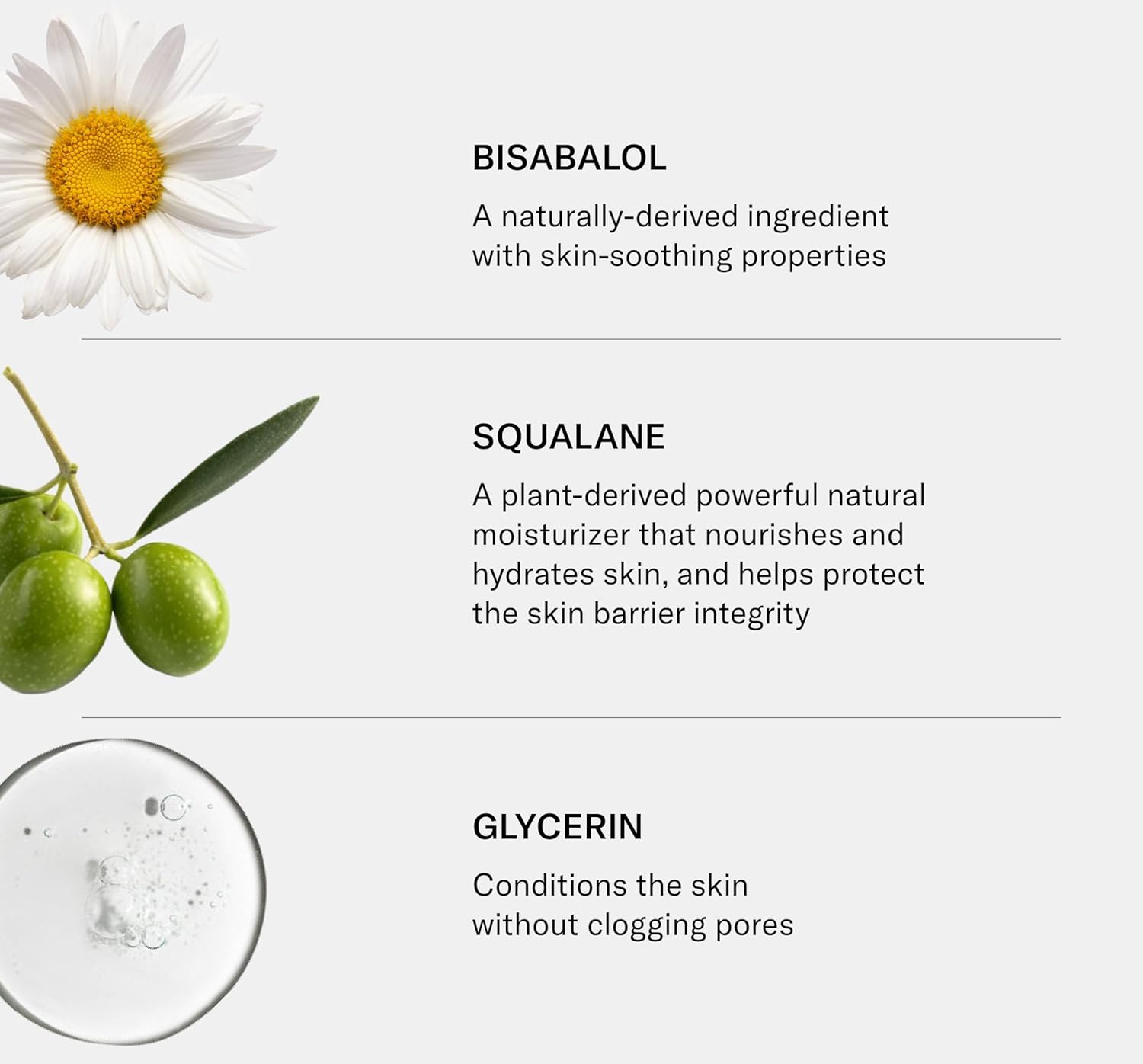 • Hero Ingredients: Bisabalol: A naturally-derived ingredient with skin-soothing properties. Squalane: A plant-derived powerful natural moisturizer that nourishes and hydrates skin, and helps protect the skin barrier integrity Glycerin: Conditions the skin without clogging pores.
