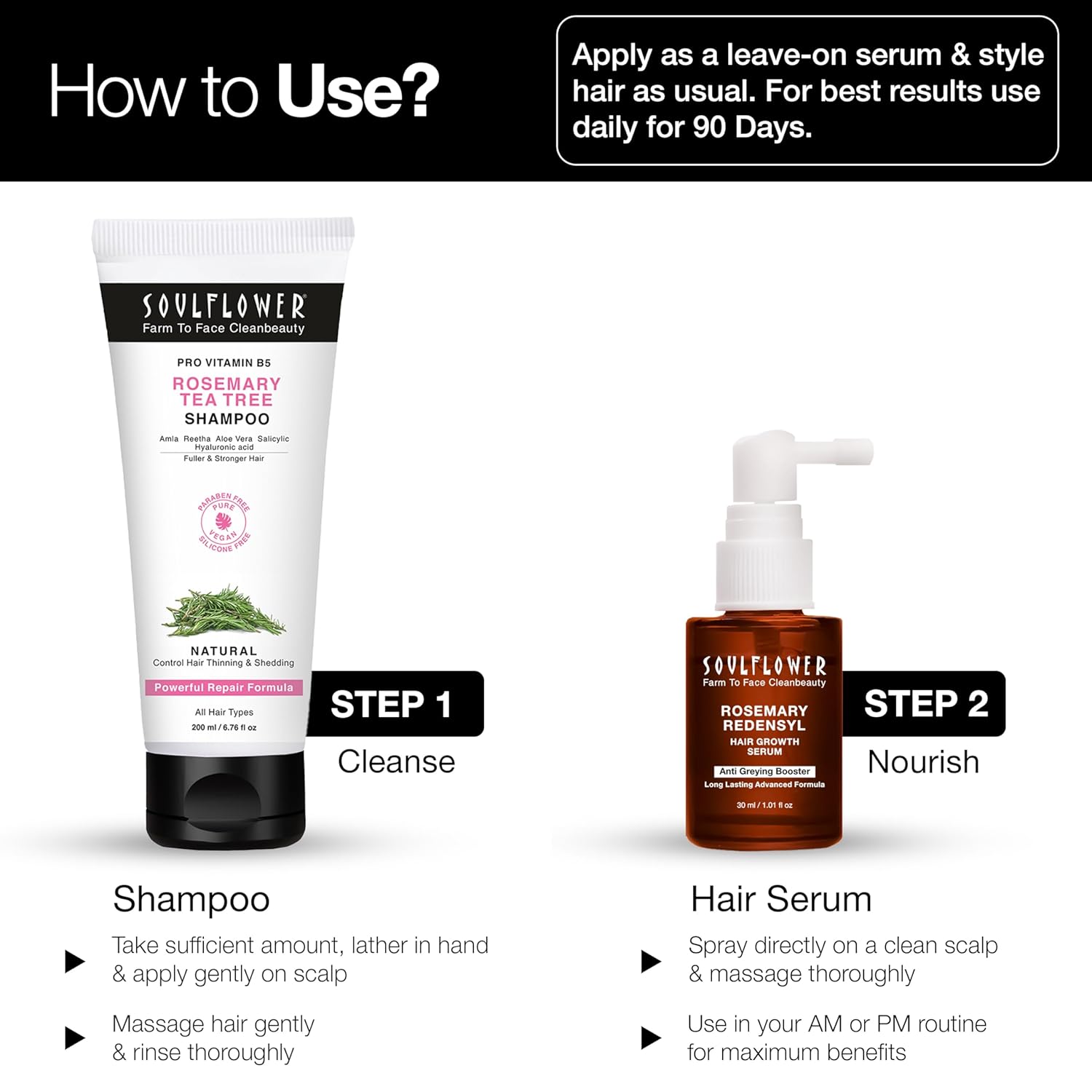- HOW TO USE: Spray the serum directly on a clean scalp & massage thoroughly. Do not rinse immediately, leave it overnight. You can apply it as a leave-on serum (No need to wash) and style your hair as usual.