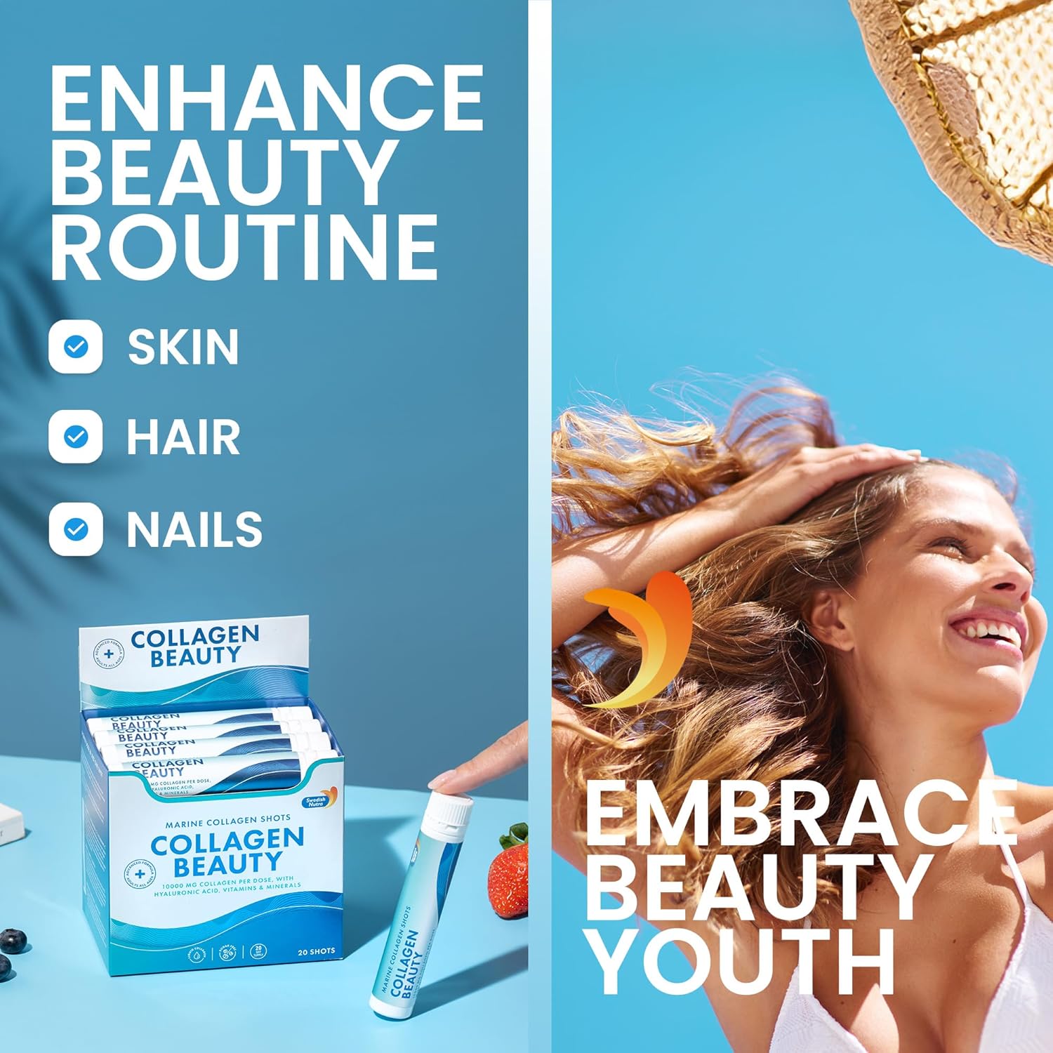 Swedish Nutra - Collagen Beauty | 10,000 mg Hydrolyzed Marine Collagen Liquid Supplement - 30 x 25 ml Daily Shots | Hyaluronic Acid and Vitamin C to Support Healthy Hair, Skin, Nails | Sugar-Free