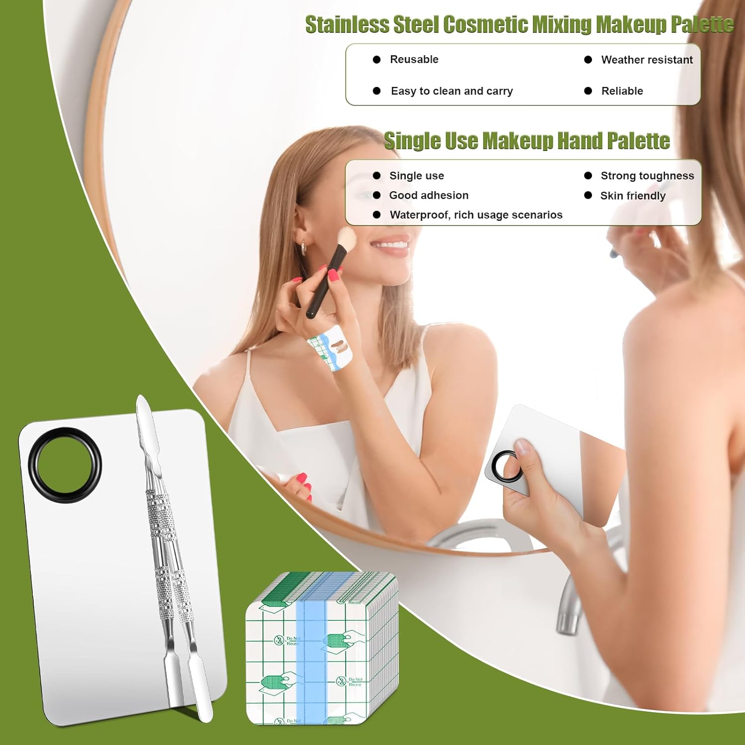 Makeup Mixing Palette Set, Makeup Hand Palette Single Use Makeup Mixing Tray Disposable Adhesive Cosmetic Makeup Palette Transparent Makeup Tape, Stainless Steel Foundation Mixing Palette with Spatula