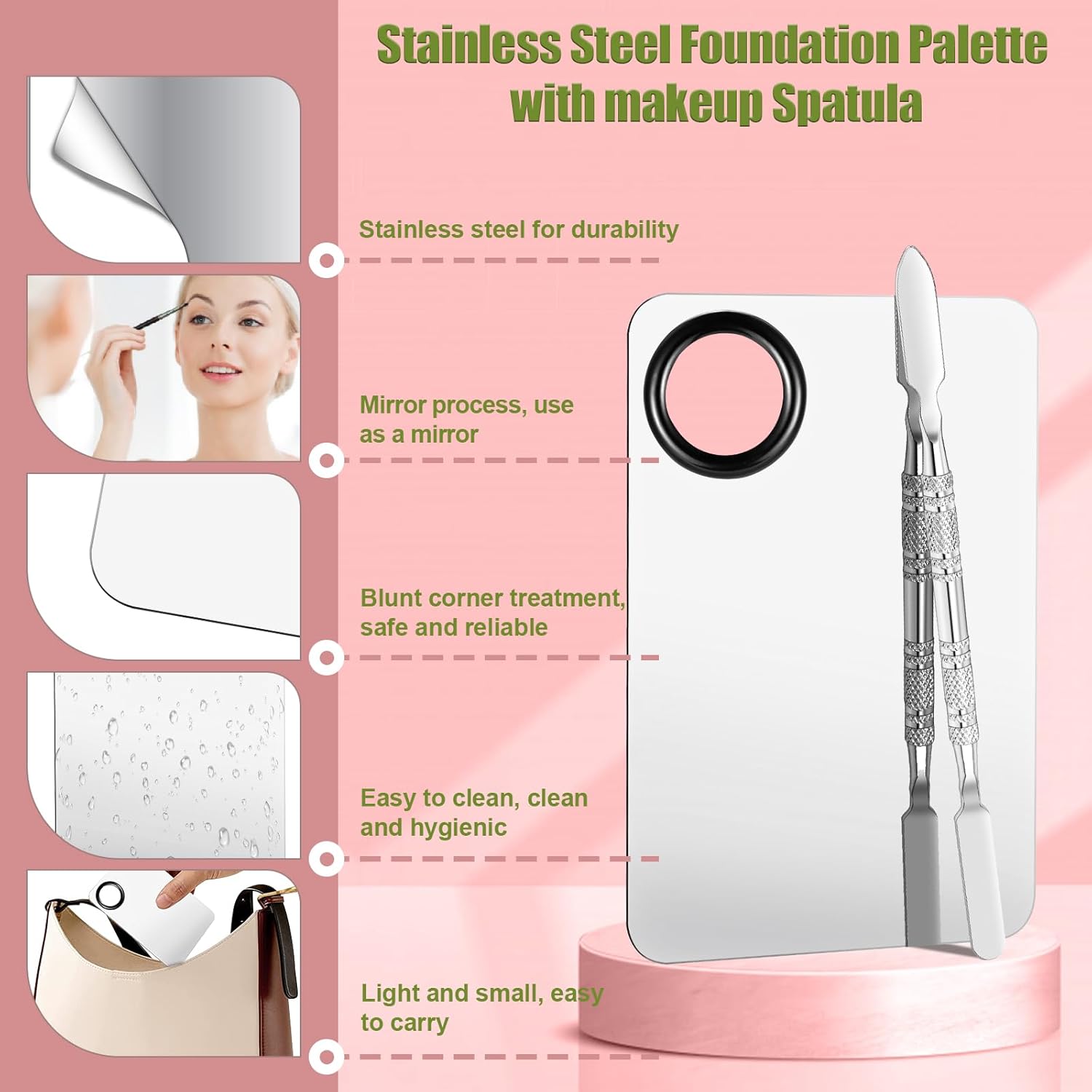 - 6.【Combination Features II】Stainless steel foundation mixing tray for mixing foundation and manicure, lightweight and compact, easy to carry, pre-drilled round holes are easy to grip the makeup tray. Smooth surface, sturdy and reliable, not easy to rust, can be quickly cleaned with paper towel or water, the makeup palette is mirrored and can be used as a mirror when needed.