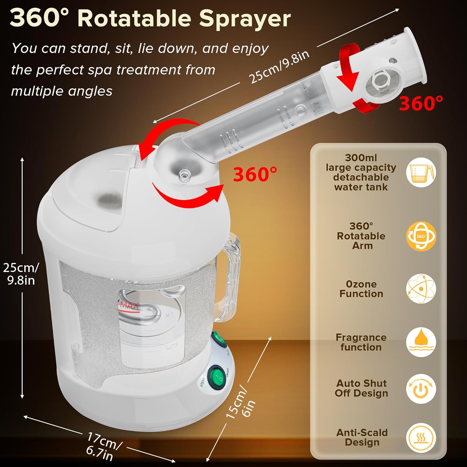 - 【360° Rotating Sprayer】: The sprayer angle can be adjusted according to your needs, you can lie, stand, sit, you just need to stay there in the most relaxing and comfortable way to enjoy the perfect facial spa. Keep your face at least 8 inches from the nozzle to avoid burns.