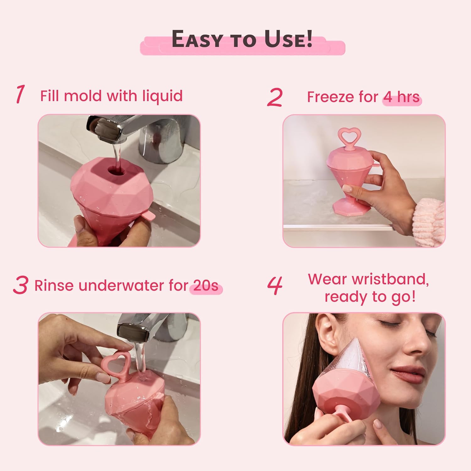 Rena Chris Ice Roller for Face: Diamond Ice Facial Roller, Reach Detailed Areas, De-Puff Eye Bags, Reusable Silicone Massage Ice Mold with Face Wash Wristband, Skin Care Tools for Women(Pink)