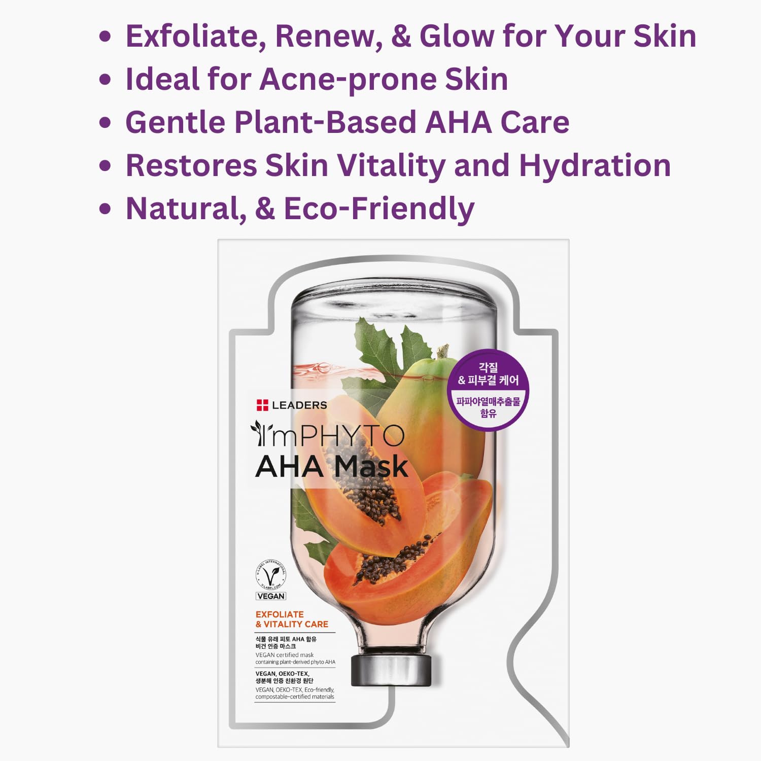 - CERTIFIED VEGAN & CRUELTY-FREE β Leaders I'M PHYTO AHA Mask has been officially certified by Italy's V-Label, ensuring our products are free from animal-derived ingredients and has not been tested on animals, so you can feel good about indulging in our skincare products. Ideal for individuals prioritizing ethical and sustainable beauty solutions, our AHA Mask delivers effective skincare results with eco-friendly practices. Embrace the feeling of exfoliated, revitalized skin and good conscience!