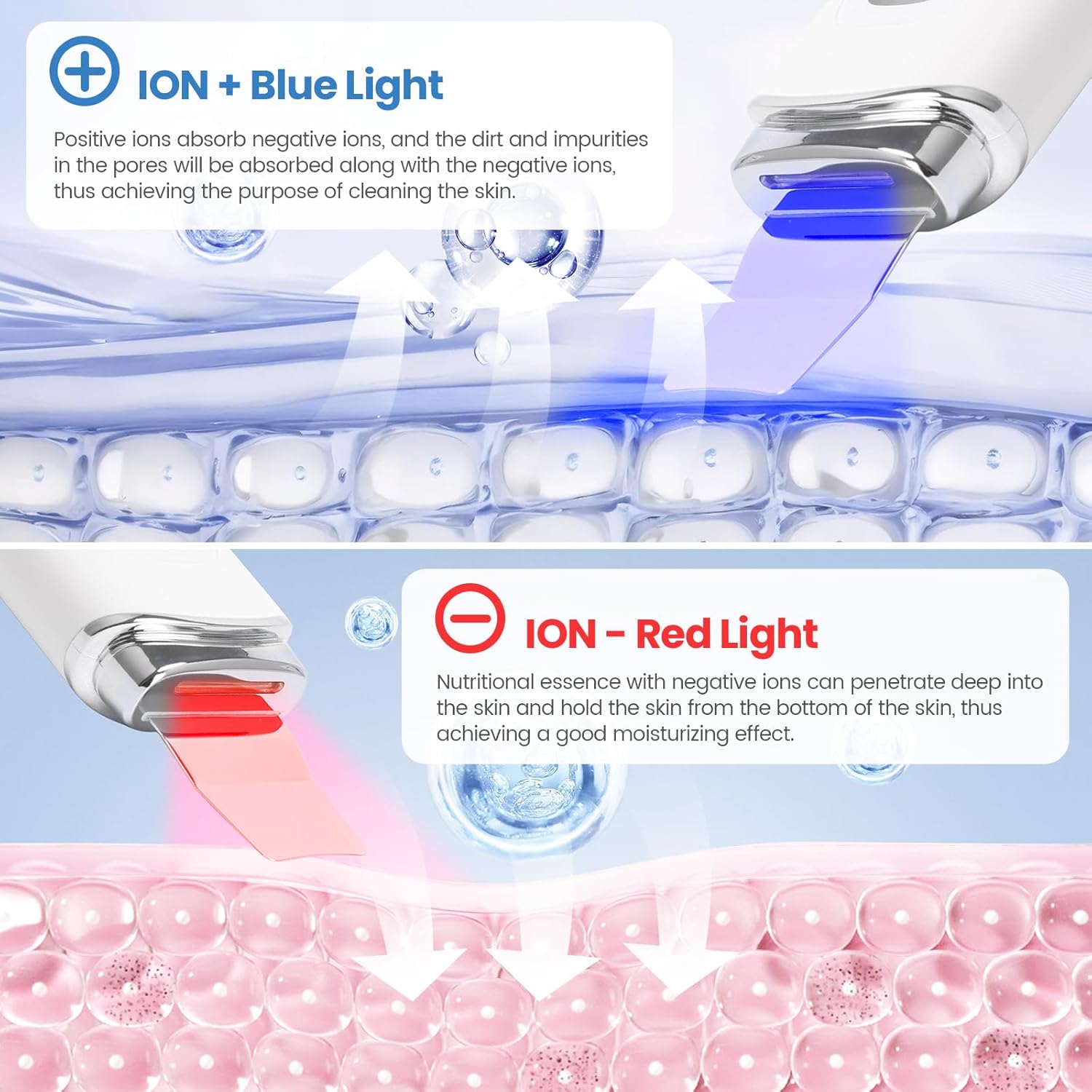 - 【Use Steps】One button for easy use, long press and hold the power button to start the machine. Use on moist skin and avoid prolonged exposure to a single area. Start by using the " Ion+ Mode" with the cleanser or toner to do the basic cleaning and deep cleansing. Then use "Ion- Mode" to assist in the application of creams, essential oils and other skincare products to optimise their benefits. Finally, use 'Lifting mode' to massage and complete your skincare routine. 2-3 times a week for at least 2 months is recommended for optimal results.