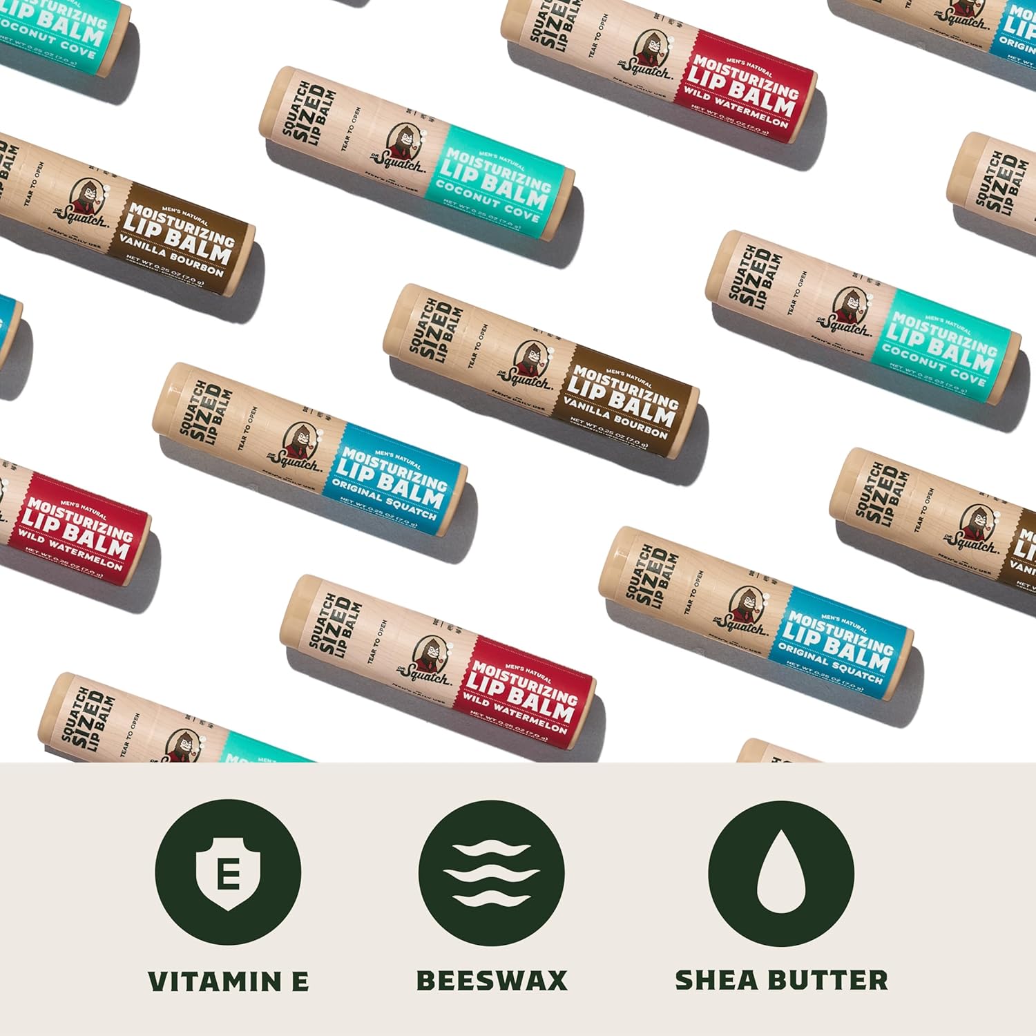 Dr. Squatch NEW Natural Lip Balm - Petrolatum, Paraben, Artificial Flavor-free - Shea Butter, Beeswax, Vitamin E - Original Squatch, Vanilla Bourbon, Coconut Cove, Wild Watermelon (0.25 oz, 4 Pack)