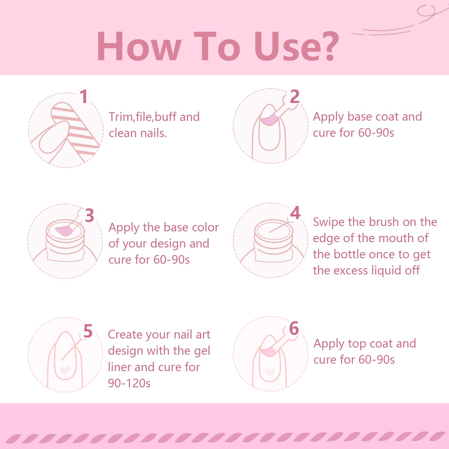 • Nail Lamp Curing: Nail Art Gel Base Coat Set Brush is simple, easy and fast to operate , LED nail lamps have an average curing time of 60-120 seconds and require a base coat and top coat.
