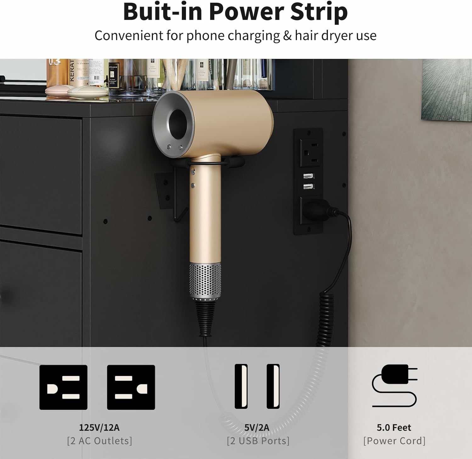 - Convenient Power Station:Stay charged and connected with the built-in power outlet, featuring a dedicated hairdryer rack along with 2 standard plug sockets and 2 USB ports. This makeup vanity allows you to power up your devices or styling tools while you effortlessly create your perfect look